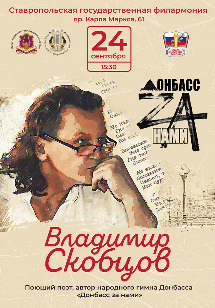 24 сентября 15.30 в Ставропольской государственной филармонии состоится творческая встреча с поэтом, прозаиком, председателем клуба авторской песни Донецкой Народной Республики Владимиром Скобцовым — «Орфей Донбасса».