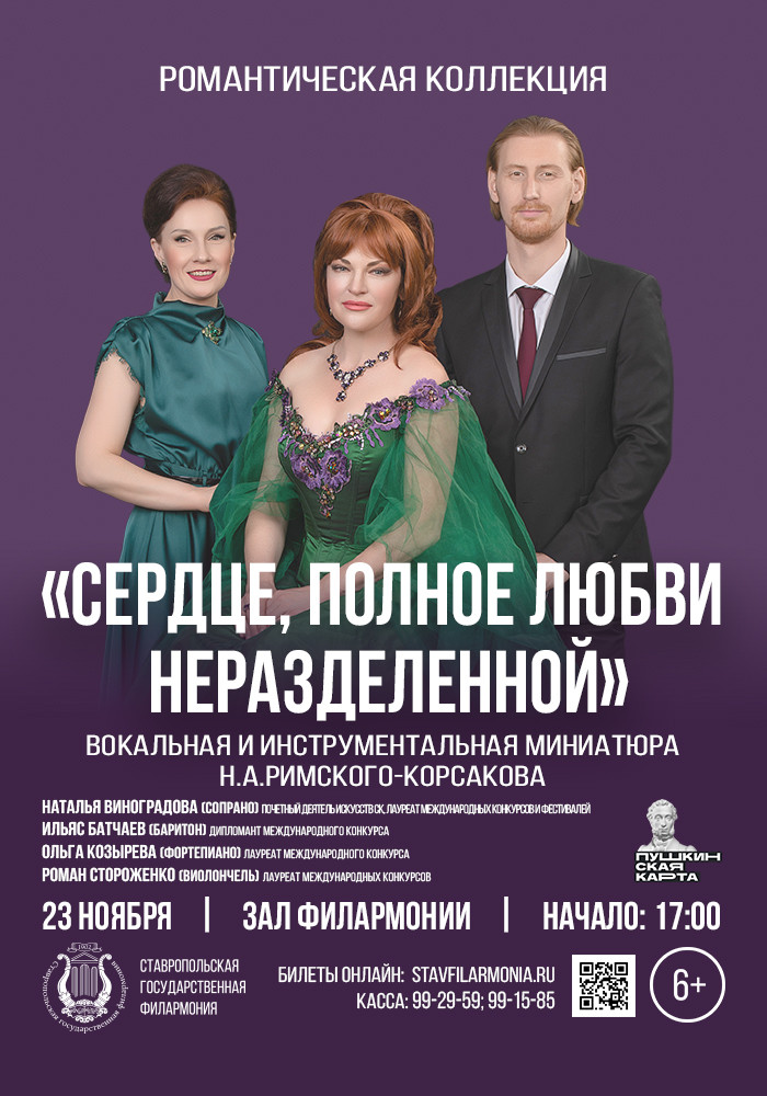 Продолжая серию концертов из цикла «Романтическая коллекция», мы приглашаем вас на прекрасный вечер вокальной музыки, посвященный выдающему русскому композитору, мэтру петербургской композиторской школы — Николаю Андреевичу Римскому-Корсакову.